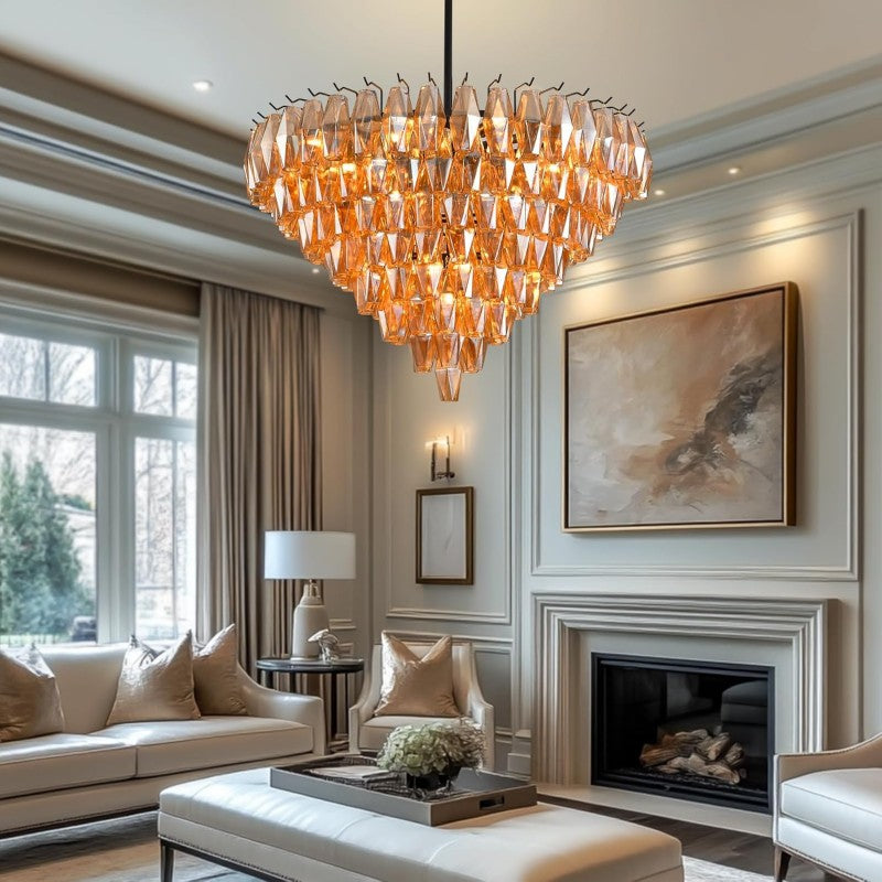| This chandelier is suspended from a tiered steel frame with dozens of hand-blown glass polyhedra on individual hooks. Illuminated from within, the faceted chandeliers dramatically reflect and refract light. A tribute to the Italian lighting style of the 1950s with this minimalist style. |