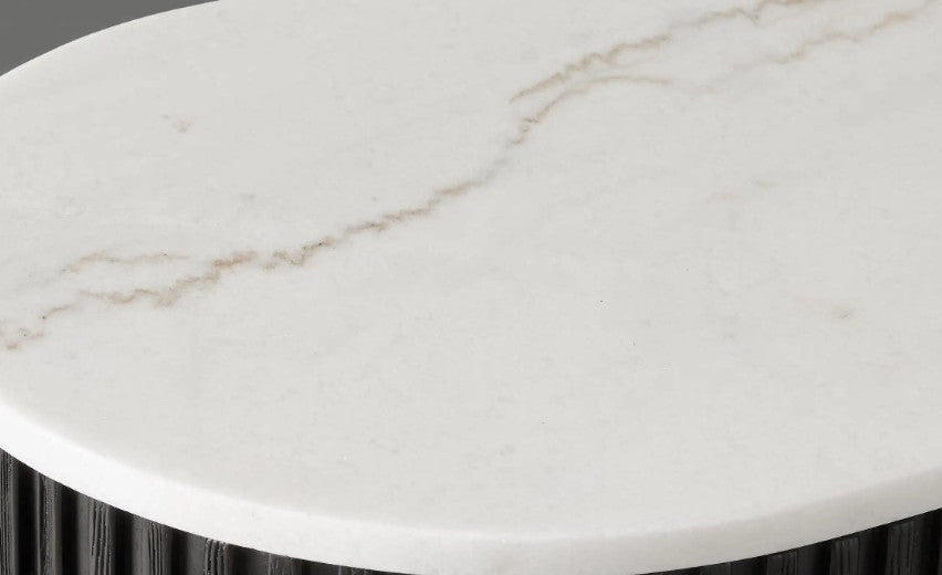 Our nightstand showcases a stunning mixed-material design, inviting elevated style into any space. Hand-finished pine from Finland or white oak wood is luxuriously accented by reeded oak detailing complemented by stone tops. The result is an eclectic-yet-chic accent piece that easily fits into the aesthetic of your home from the living and dining rooms to bedrooms, office spaces, and more.