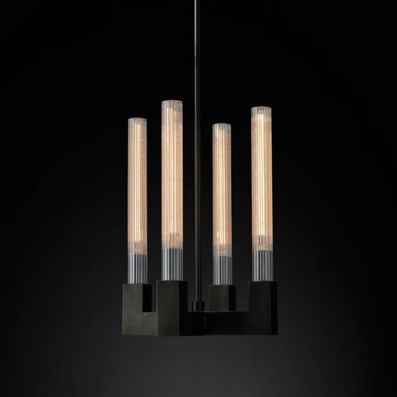 This Pendant is a reinterpretation of the simple art chandelier form in solid brass. The fixture features clean lines and sharp angles, and its elegant prismatic glass hurricane showcases an Edison filament bulb that flickers inside like a candle.