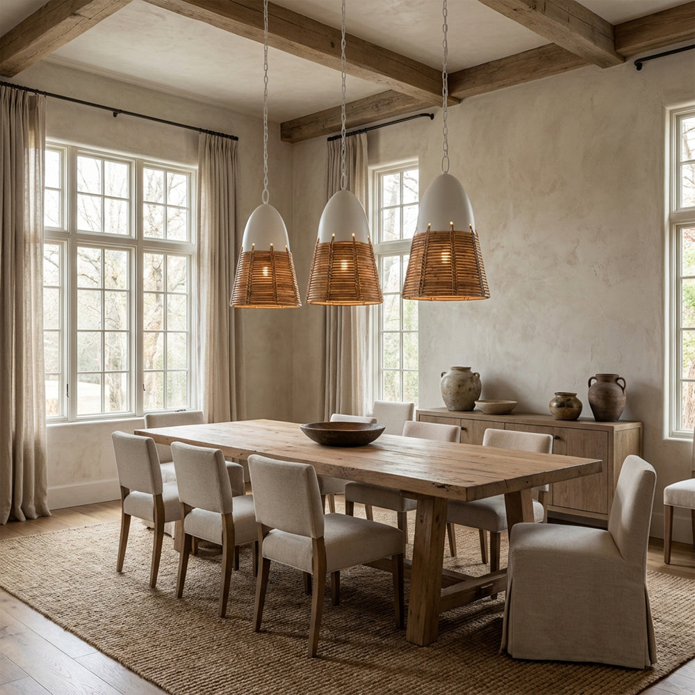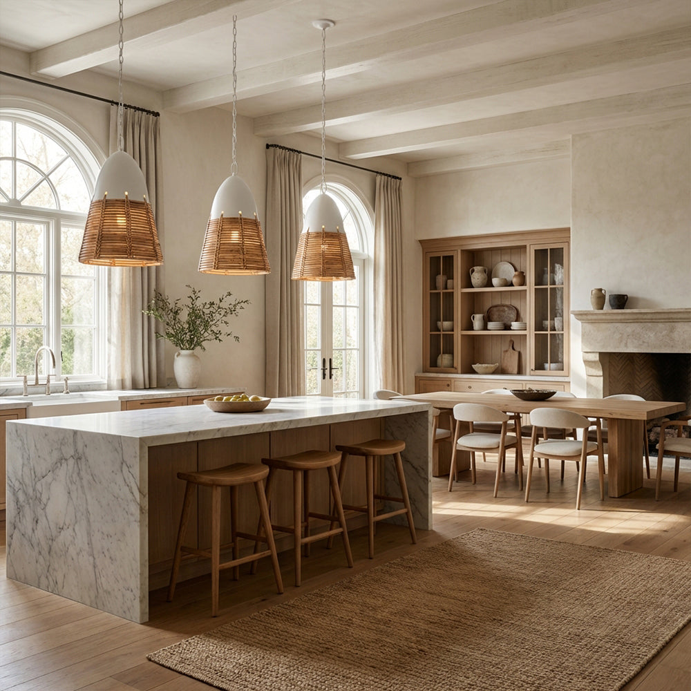 Embrace the beauty of raw texture with the Arundel Organic Reeded Drum Pendant. Layers of natural dried reeds are meticulously bound by a hand-forged black iron frame, creating a striking cylindrical silhouette. This organic masterpiece filters light into a warm, rhythmic glow, making it a sophisticated focal point for modern coastal estates and organic minimalist interiors.