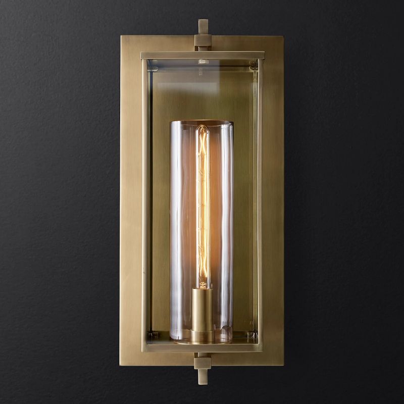 The lamp is on a square crossbar away from the wall, in a glass box that seems weightless. The clear glass shade gives the impression of a pillar candle, with the bulb clearly visible inside. It is both simple and flamboyant.